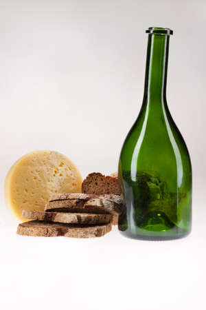 a brown glass bottle stands on a board, the evening sun shines through the bottle