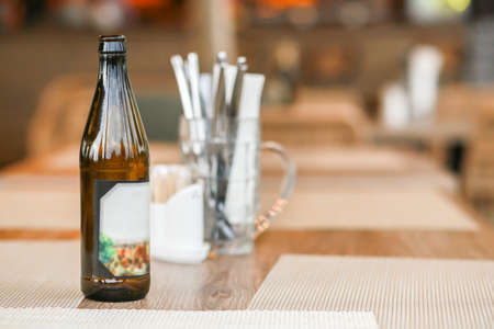 Top-Down View of Glass Bottle Rim, Bore, Orifice or Throat. Blurred Empty Glass Bottles, Wooden Background. Healthy Living and Detox Concept. Abstinence, Alcoholism Treatment.
