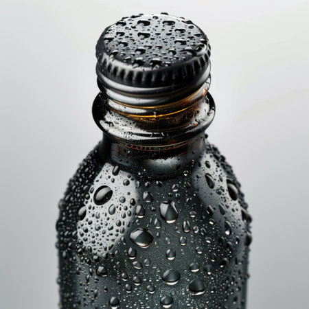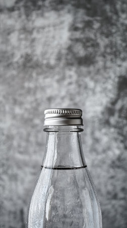 Glass bottle with condensation against textured background, minimalist design concept
