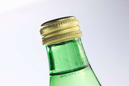 A metallic cap is positioned at the top of a clear glass soda bottle reflecting light.