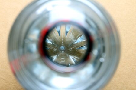 A high angle closeup shot of a glass jug on a wooden surface