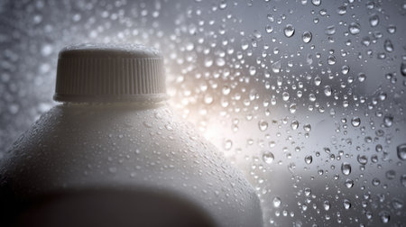 Of a damp, clear glass container with a white trigger top, placed on a bright, smooth white marble surface under soft natural lighting.