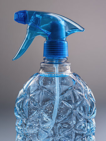A modern clear spray bottle filled with a cleaning solution rests against a soft color background, perfect for illustrating home care, hygiene, and cleanliness.