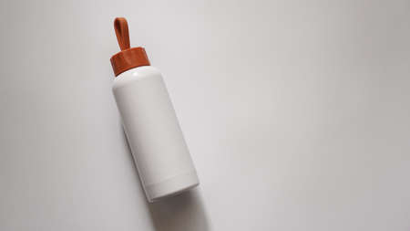 White bottle of spray for cleaning on red background. Top view. Minimalism