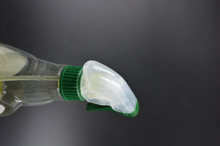 Spray bottle for cleaning and disinfection on a dark background. Clear, white matte bottle with green clear spray, window cleaner, glass cleaner.