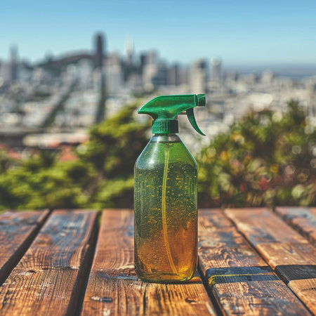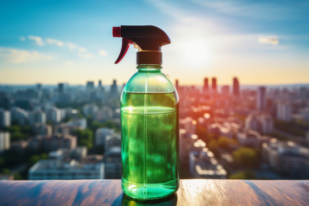 A green spray bottle filled with a clear liquid sits on a table with a blurred cityscape in the background. The spray bottle is in focus, and the cityscape is out of focus.