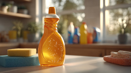 A bottle of cleaner with a white label on a yellow background. Template for text or design