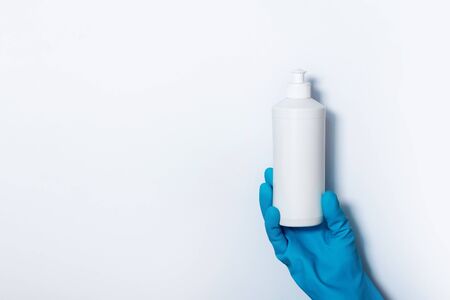 Hand in glove holding white plastic bottle of cleaning product, household chemicals. Copy space. Cleaning service concept. Household chemical cleaning products, brushes and supplies. Detergent bottle.