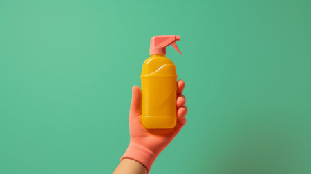 Hand in yellow rubber glove holding plastic spray bottle with cleaning detergent on yellow background