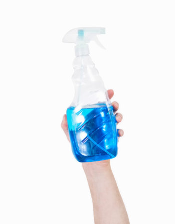 Man's arm raised holding a glass cleaner sprayer. Hygiene concept. Isolate on white background.