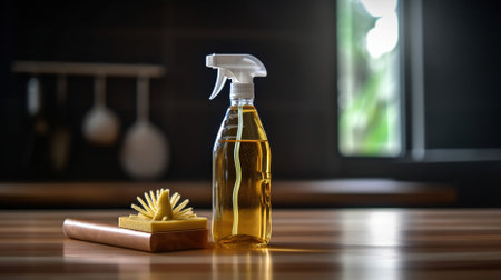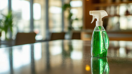 Green cleaning spray bottle on a polished kitchen island with reflection