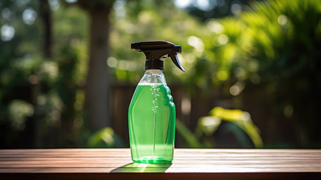 A green spray bottle sits on a wooden table. In the background is a blurred cityscape. The spray bottle is filled with a clear liquid. The table is made of natural wood and has a warm brown color.@240805_