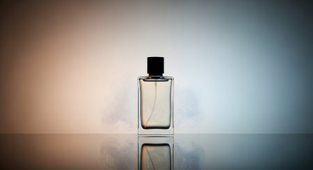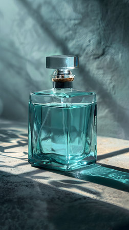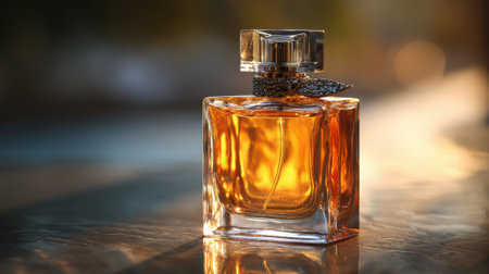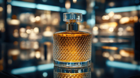 A beautiful glass perfume bottle sits elegantly on a smooth, reflective surface, illuminated by soft light creating captivating shadows and reflections.