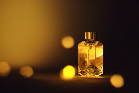 An AI generated illustration of a golden perfume on a white surface with yellow bokeh lights