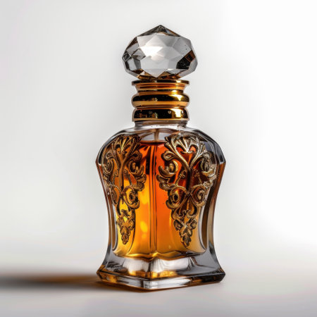 An exquisite vintage perfume bottle showcasing a stunning amber liquid. The ornate design and crystal top reflect light beautifully, adding elegance to any setting.