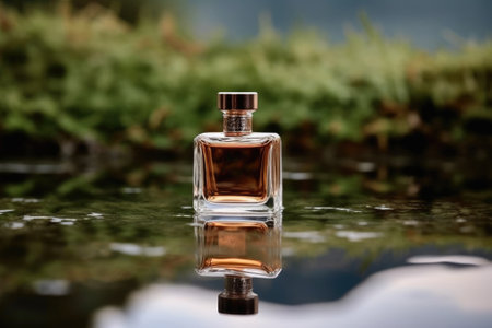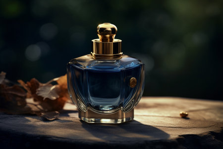 A stylish product photography featuring a bottle of blue perfume placed on a wooden surface amidst a beautiful outdoor setting. Ai generated