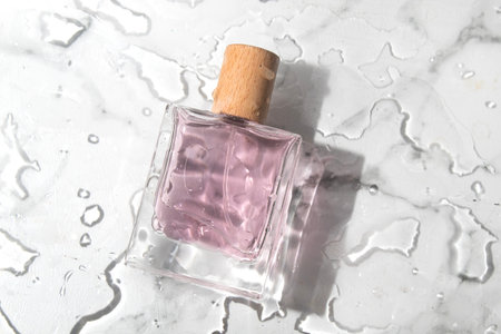 Fragrance and perfume template. Beautiful glass bottle with purple perfume on white rock. Concept of luxury perfumery.