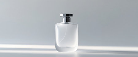 A beautifully designed clear glass perfume bottle showcased in soft light and shadows. Perfect for beauty, fragrance, or minimalistic design themes in photography.