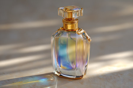 This image features an elegant glass perfume bottle, beautifully lit by natural light, creating a serene and sophisticated atmosphere.