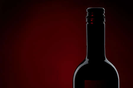 Red Wine bottle silhouette isolated on black background, red backlight, horizontal with copy space