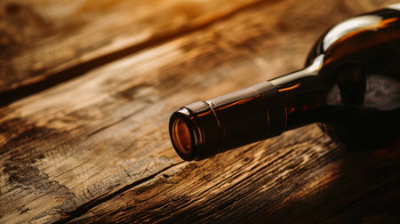 Close up view of wine bottle resting on rustic wooden surface, showcasing elegant neck and cork. warm lighting enhances rich colors of glass and wood, creating cozy atmosphere