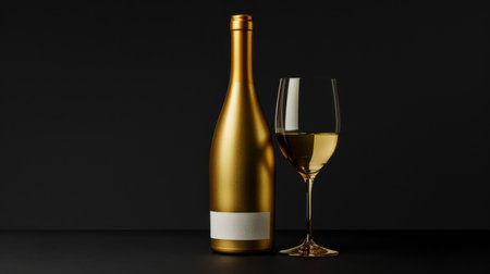 Elegant golden wine bottle with matching glass, showcasing refined aesthetic against dark background. Perfect for celebrations or special occasions, this set exudes luxury and sophistication
