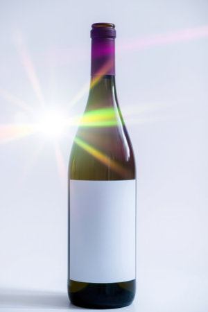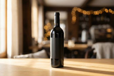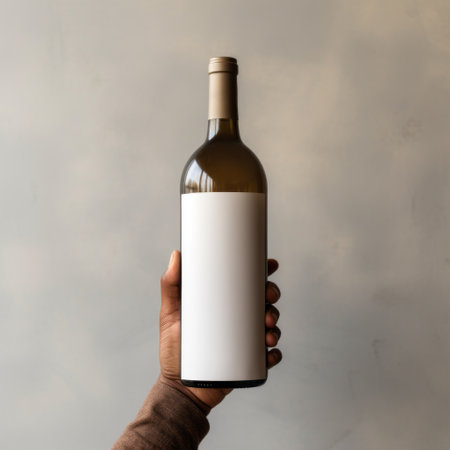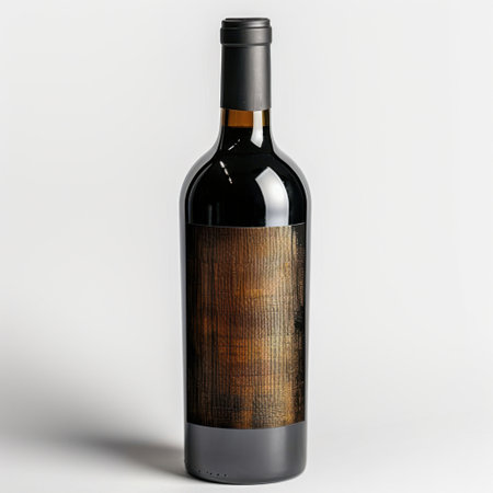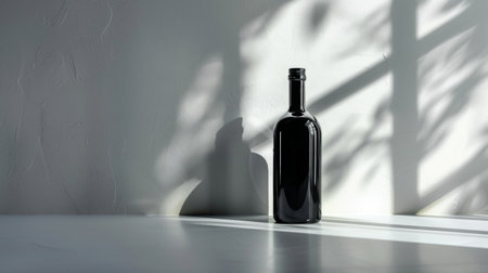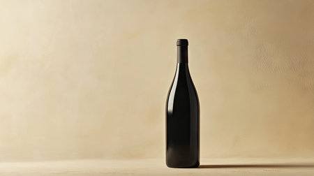 A striking glass wine bottle featuring a minimalist black label against a soft neutral backdrop, perfect for showcasing elegance in product photography and marketing.