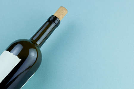 Blank wine bottle with mock up place on blue background. Product, alcohol, beverage and advertisement concept. 3D illustration.