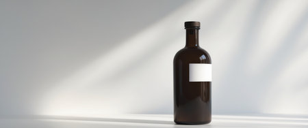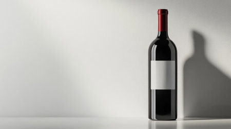 This image features a sleek red wine bottle with a blank label, casting a soft shadow against a minimalist background, ideal for design projects.