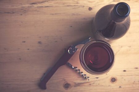 Flat lay of Red wine bottle on a wooden table background. copy space