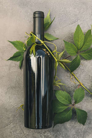 Bottle of red wine and green vine on vintage dark stone table background. Top view copy space for text. Wine shop wine bar winery or wine tasting concept.