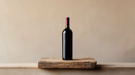 A minimalist composition featuring a single red wine bottle elegantly placed on a rustic wooden surface, perfect for classy dining and celebration themes.