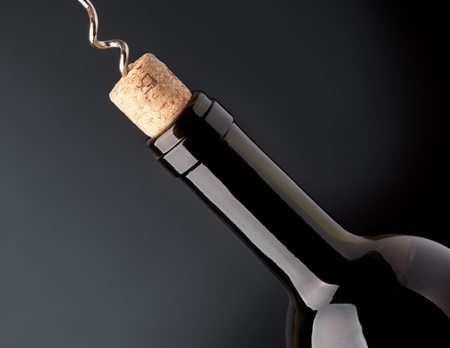 Bottle of red wine with corkscrew on old black board. Wine concept. Top view.
