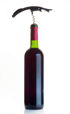 One Bottle of red wine with corkscrew on colored table. Flat lay, top view wth copy space.