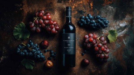 A stunning arrangement featuring a bottle of red wine, surrounded by fresh grapes and fruits. Perfect for evoking elegance and indulgence in culinary themes.