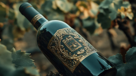 A vintage wine bottle lies nestled among lush grapevines in a vineyard. The sunlight filters through the leaves, enhancing the bottle's ornate label, perfect for the harvest season.