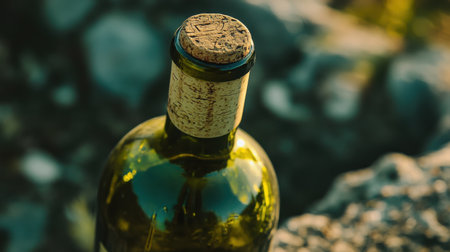 A green glass bottle with a cork is prominently displayed on a rocky surface, illuminated by warm, golden light during sunset, highlighting the natural surroundings.