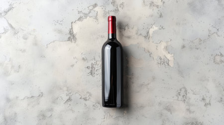 Red wine bottle with red wine glass on concrete background. Flat lay backgrund. Copy space.