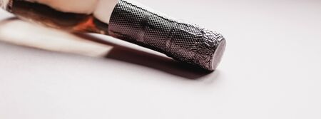 Bottle of rose champagne wine in minimal composition on pink background with copy space. Natural light. Template for tasting, degustation invitation card. Side view