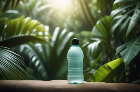 close up on plastic bottle of water with rainforest vegetation and tropical foliage