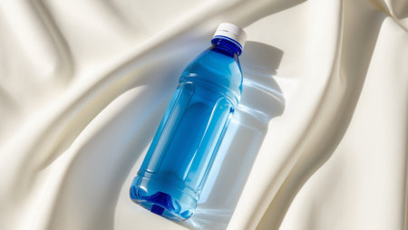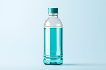 AI Generated. Clear plastic bottle filled with blue water on a light background with a simple design