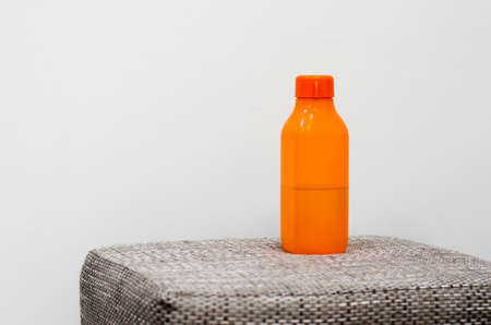 Orange plastic bottle with water on a beige background. Sports water bottle