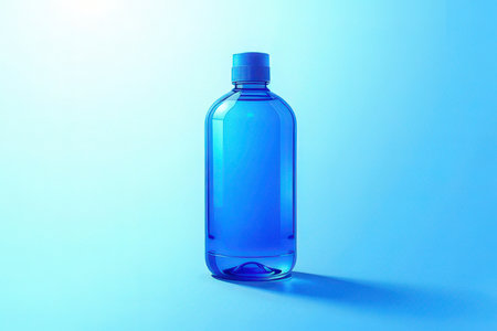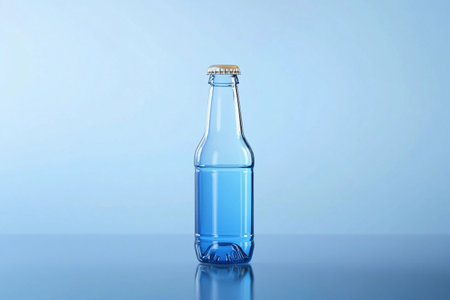 A beverage bottle filled with blue liquid stands on a smooth background under soft lighting.