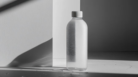 This minimalist image features a transparent water bottle with condensation set against a light and shadow backdrop, evoking a sense of purity and simplicity.