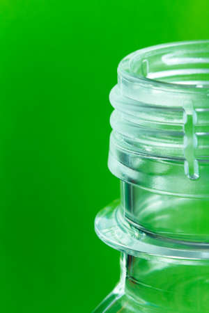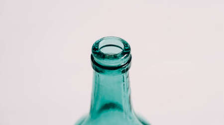A green bottle with a twist-off cap stands upright on a light blue background. The focus is on the bottles simple design and its cap is slightly turned to show its opening.