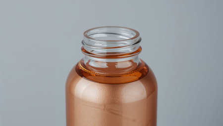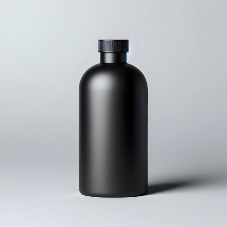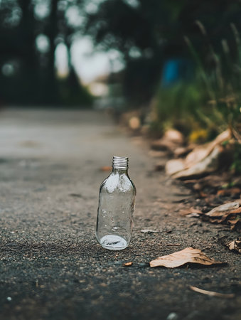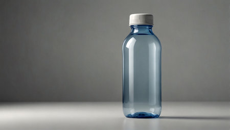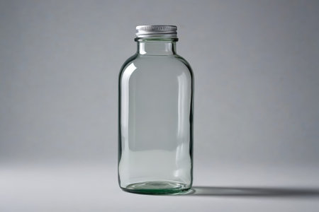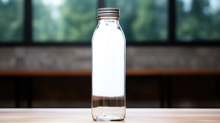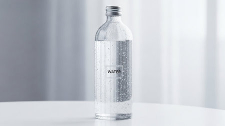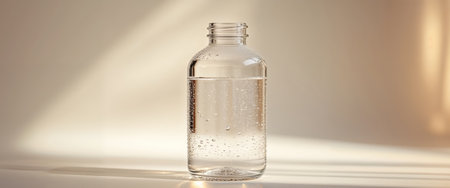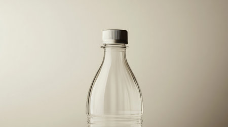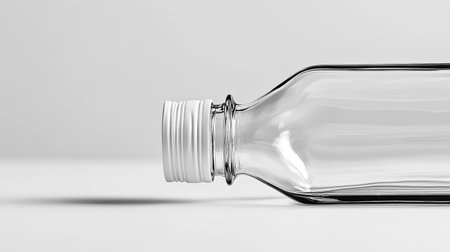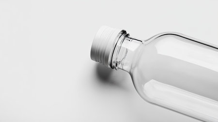 A clear glass bottle featuring a white cap rests on a minimalist surface, showcasing transparency and simplicity ideal for various design projects.