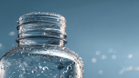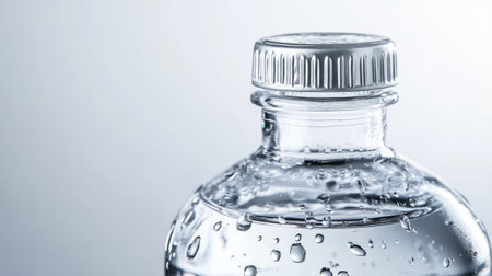 Close-up of the top section of a transparent plastic water bottle with condensation droplets forming, emphasizing freshness and detail