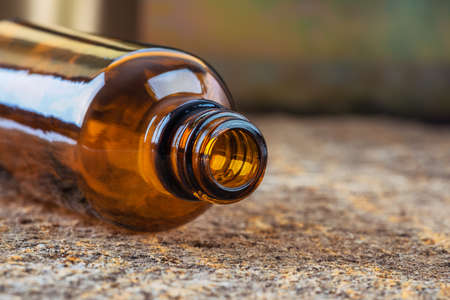 Single small brown glass bottle for medicine, fragrance, essence oil and potion lying on natural stone background