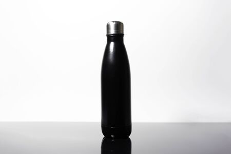 Black steel thermos, eco bottle for water, on black glass, background of white.