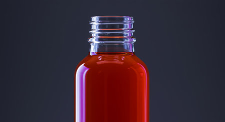 Vibrant red liquid shimmers in a glass bottle, set against a modern, dark backdrop. Perfect for branding, mockups, and showcasing drink products with a stylish edge.